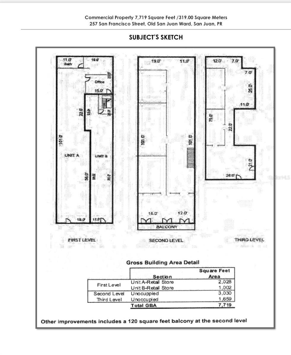 HISTORIC BUILDING LOCATED ON ONE OF THE MAIN STREET IN OLD SAN JUAN WARD. HAS GOOD FRONTAGE TO SAN FRANCISCO STREET. HIGHEST AND BEST USE COMMERCIAL. OR POTENTIAL AIRBNB AT SECOND AND THIRD LEVEL. THREE LEVEL BUILDING. GREAT FOR INVESTORS TO RENOVATED AND UPGRADE TO BEST SCALE. FIRST LEVEL 3,030 SQ.FT. , SECOND LEVEL 3,030 SQ. FT.. AND THIRD LEVEL 1,659.00 SQ. FT. GROSS BUILDING AREA 7,719 SQ FT. COMMERCIAL ZONE THREE (C-3). TOPOGRAPHY/SHAPE - LEVEL RECTANGULAR. UTILITIES - ONCE RENOVATED AND UPGRADED ELECTRIC POWER LINE, POTABLE WATER, TELEPHONE AND SANITARY SEWER, SHALL BE CONNECTED AGAIN.
