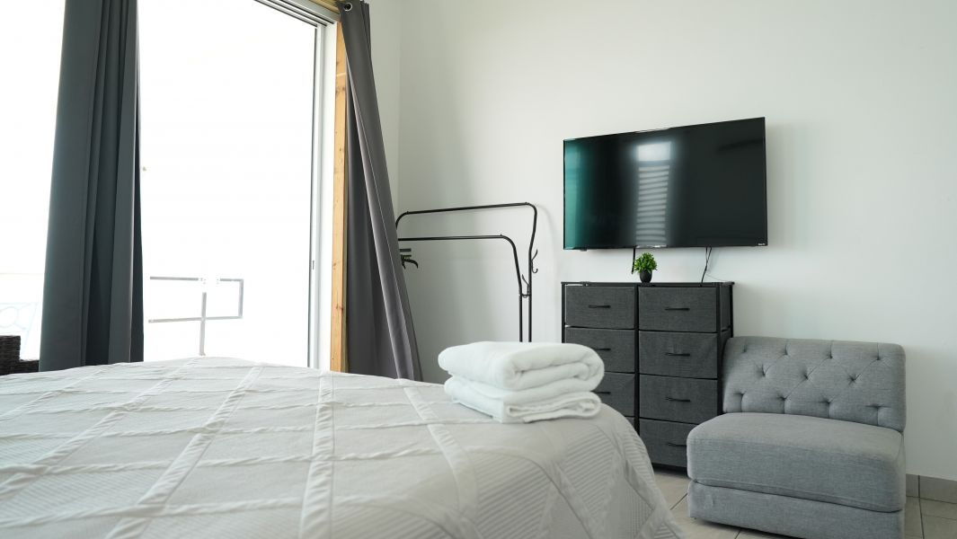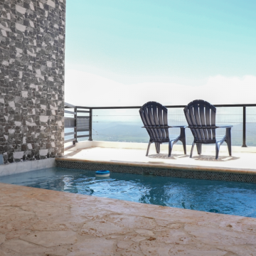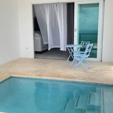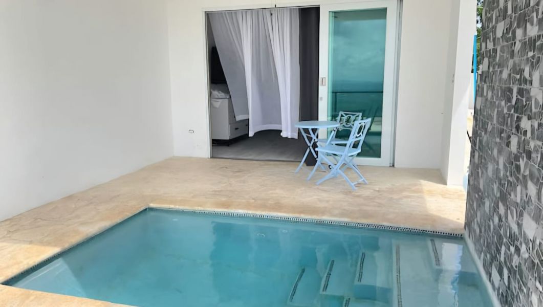 It includes one oversized bedroom, one luxurious bathroom with floor-to-ceiling tile, open-concept living and dining areas, a fully equipped custom kitchen, a private terrace with a heated pool, a BBQ area and front-row cliffside views.