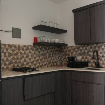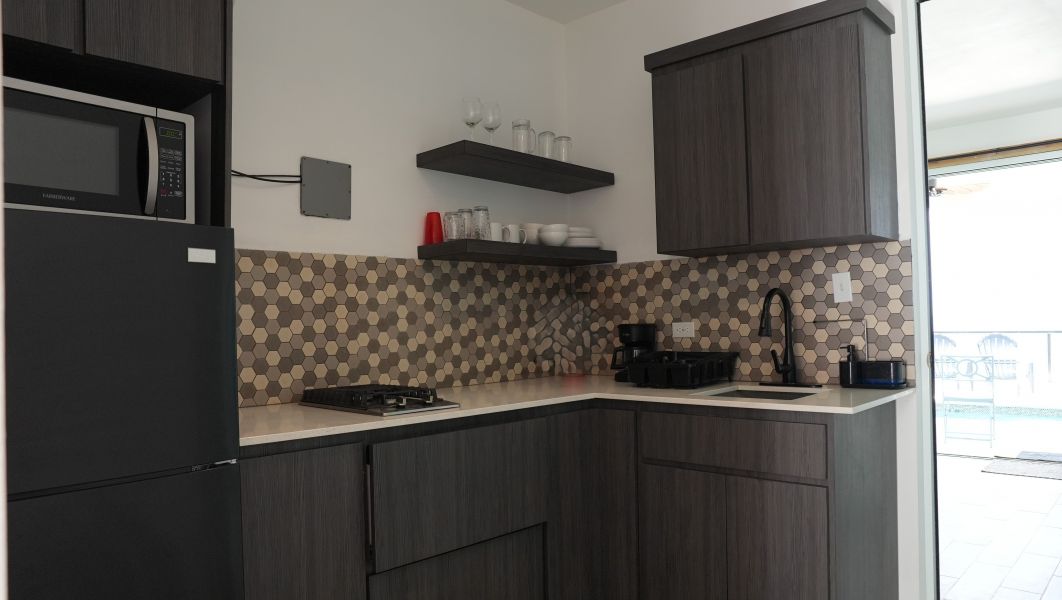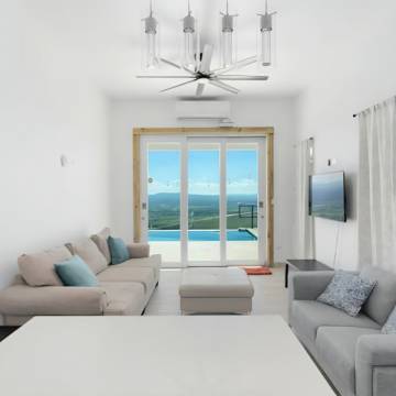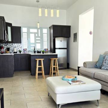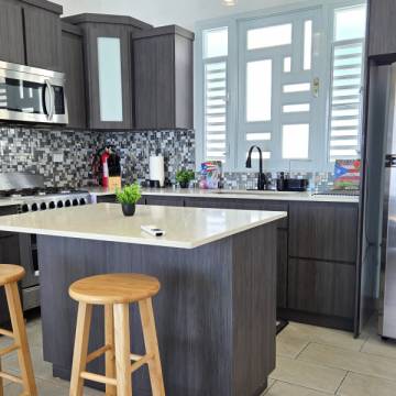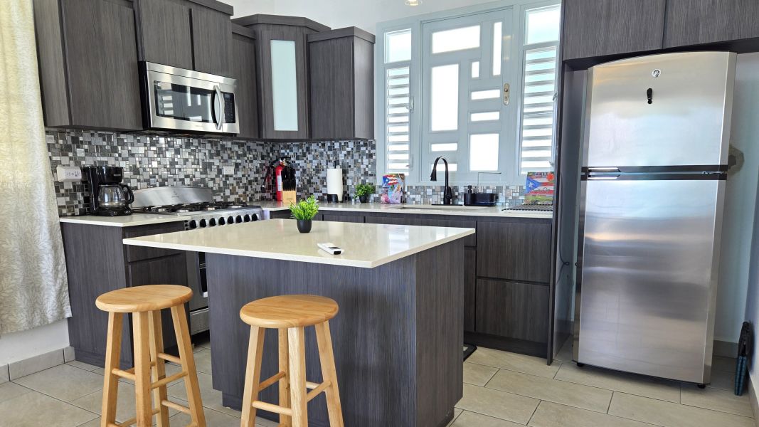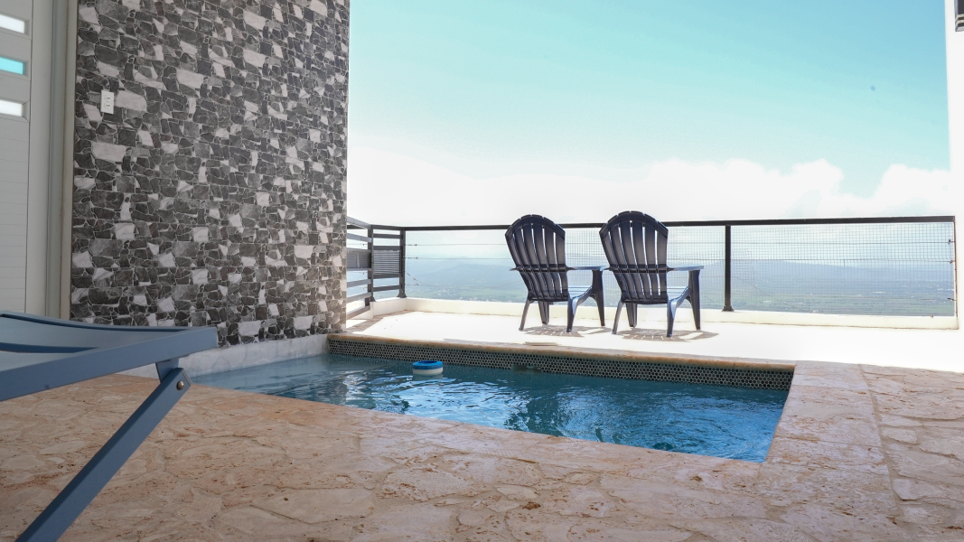 Soaring ceilings and open, sun-filled interiors lead to an expansive terrace with a private pool that frames the horizon like a work of art with BBQ area. The custom-built kitchen, crafted locally in Puerto Rico, features a striking island and quartz countertops, perfect for gourmet cooking and entertaining.