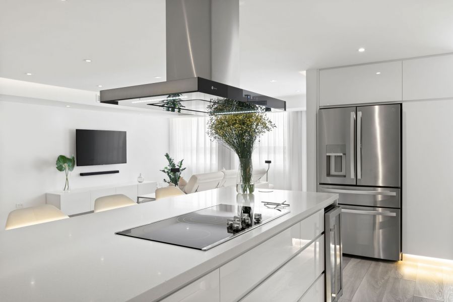 Modern kitchen with central quartz island, GE Profile appliances, and wine cooler