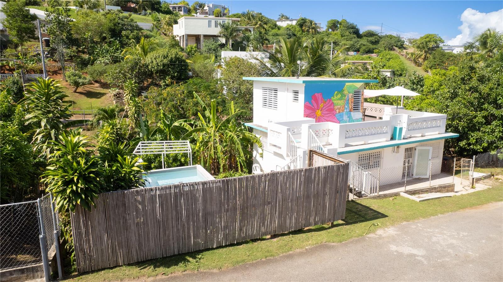 The upper level, which offers excellent potential for future expansion, includes a guest studio apartment with a private entrance and a beautifully tiled, spacious terrace—perfect for lounging, dining al fresco, or entertaining. The shaded terrace is adorned with a vibrant tropical mural and enjoys views of the garden.
