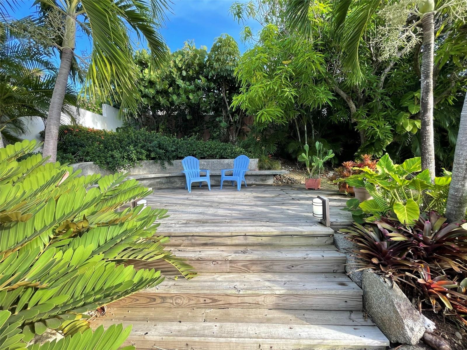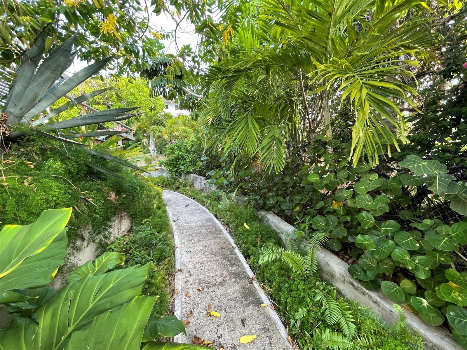 Lush tropical landscaping with mature trees and flowering plants