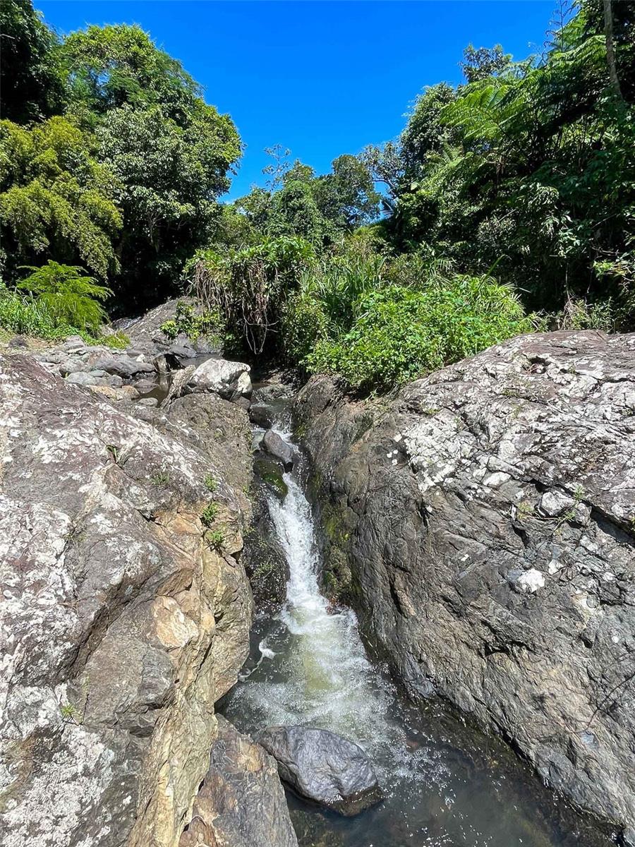 Discover a rare opportunity to own a unique riverfront property located in the Colinas de Cubuy neighborhood of Canóvanas, Puerto Rico, directly adjacent to El Yunque National Rainforest. This expansive property encompasses approximately five cuerdas of lush tropical land and is bisected by the Cubuy River, creating a private natural sanctuary with waterfalls, natural pools, and dramatic boulder-lined riverbanks.