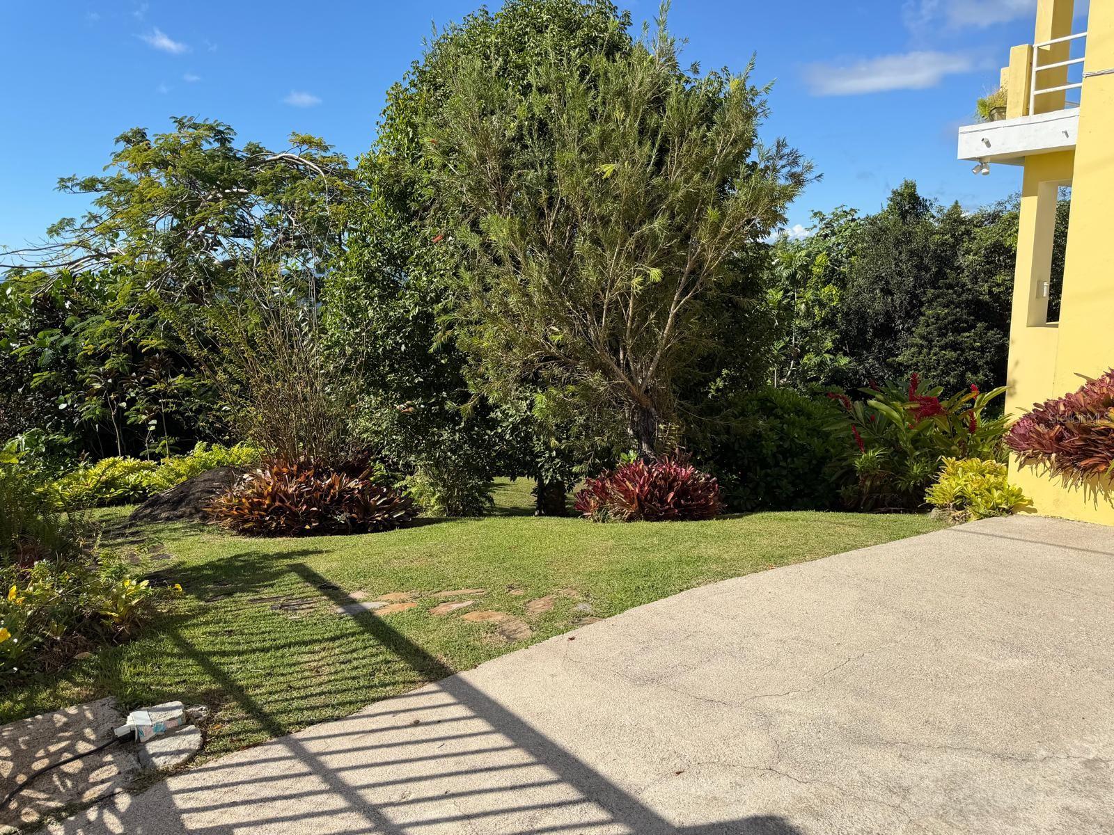 The property is surrounded by fruit trees and ornamental plants, including breadfruit, plantain, papaya, fig, mango, dragon fruit, pomarosa, loquat, coconut, and banana trees.