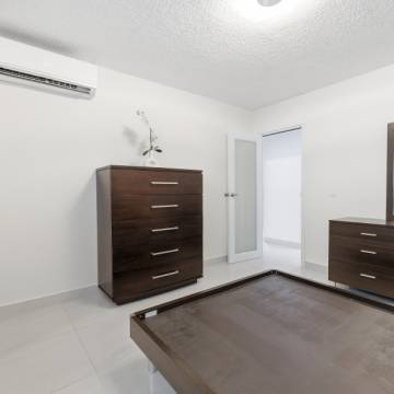 Ubicado en Condominio Los Pinos Este, a pocos minutos de la playa y justo frente al Fairmont El San Juan Hotel. Todo ha sido actualizado — cocina renovada con gabinetes modernos, fascias nuevas y aires acondicionados individuales en cada habitación y en la sala.