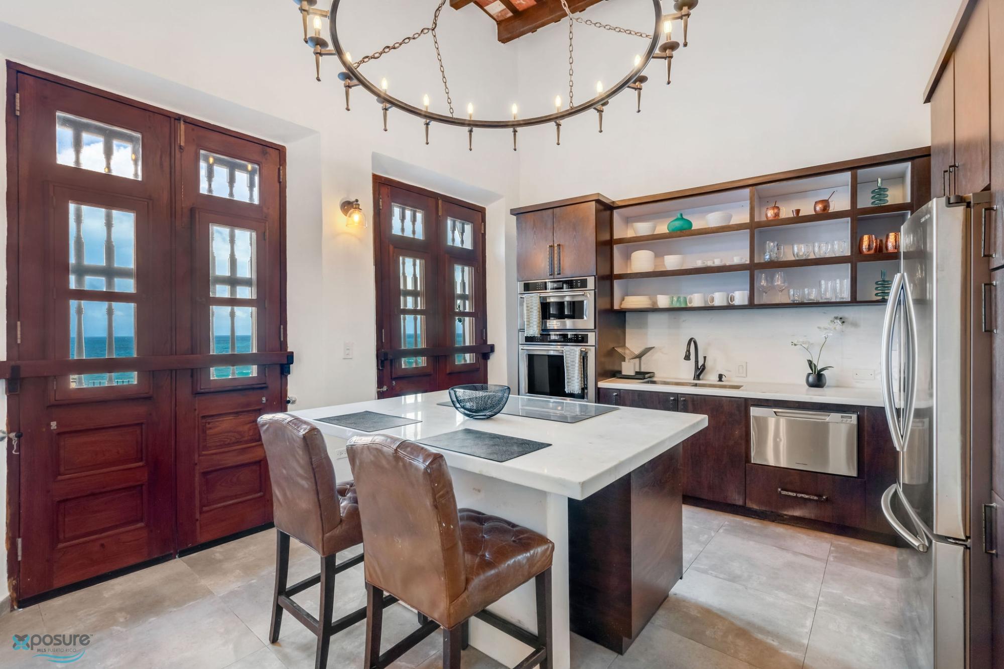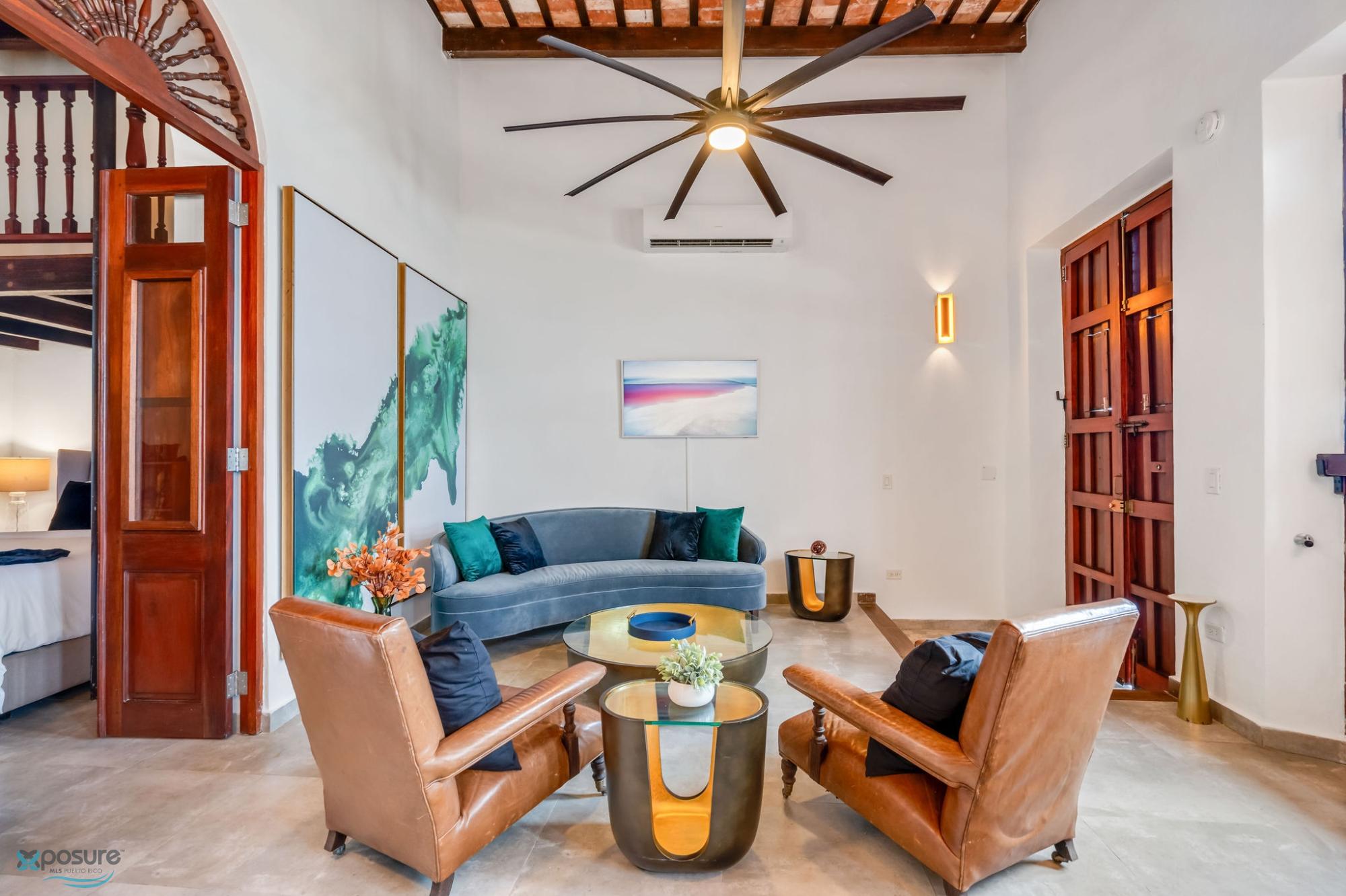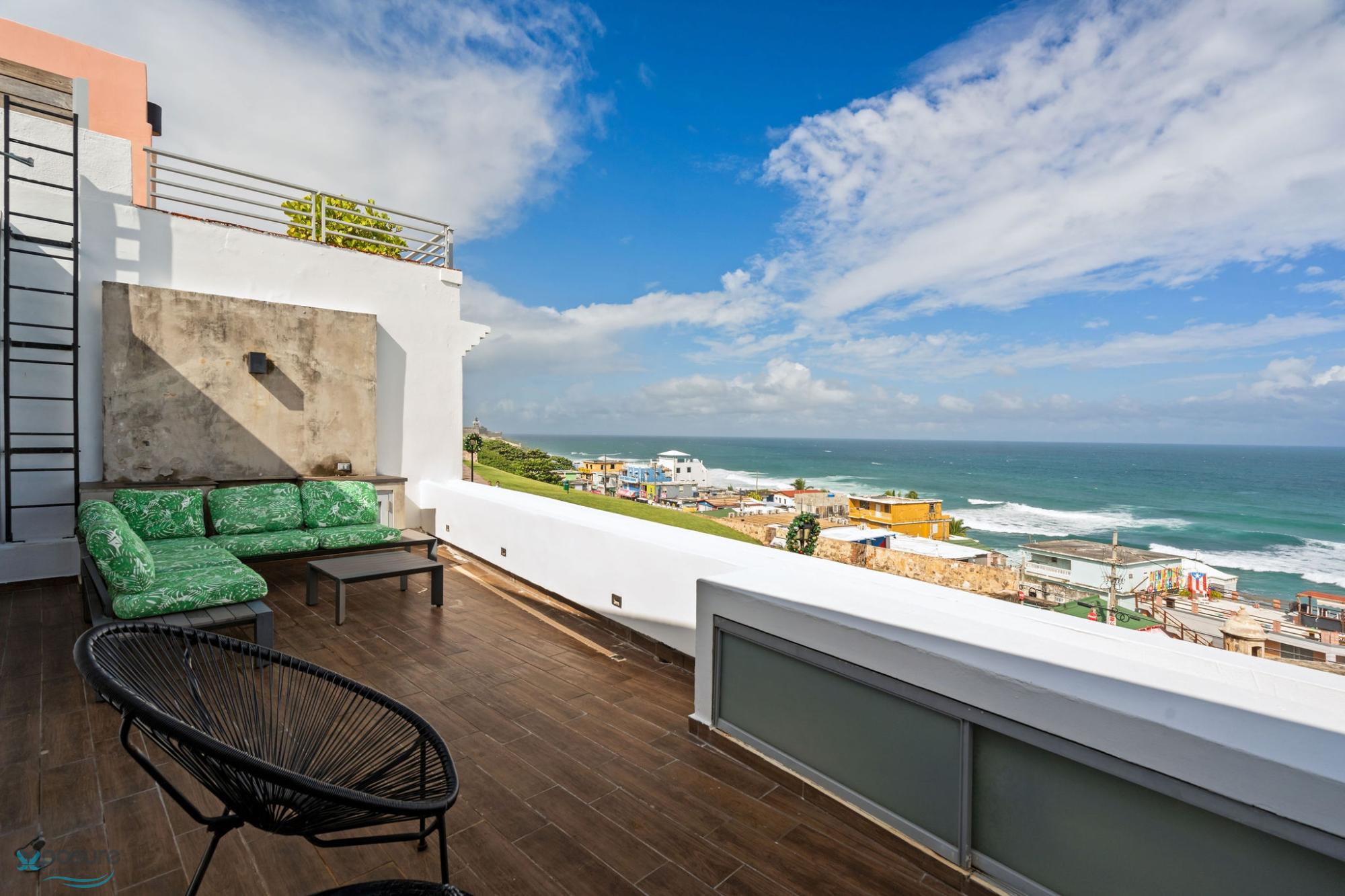 Alójese en la histórica muralla del Viejo San Juan y disfrute de la combinación perfecta de ambiente atemporal y comodidad moderna. Esta exclusiva villa se encuentra a pocos pasos de monumentos históricos, vibrantes plazas y hermosas playas. Un pintoresco paseo marítimo pasa junto a su puerta, que conduce a la playa El Escambrón y al Condado. Características destacadas: Villa de dos niveles con vista al mar, cómoda sala de estar, cocina abierta, comedor y espacio de trabajo, dormitorio con cama queen y baño privado en la planta baja, loft con dos camas individuales entre los dos pisos principales, suite principal con cama king y vestidor, ducha con vista al mar y terraza en el segundo piso. La terraza incluye asientos al aire libre y bañera de agua fría, cocina equipada, dos dormitorios (una cama queen y una king), dos baños, loft, patio interior, escalera al aire libre, terraza con vista al mar y lavadora/secadora..