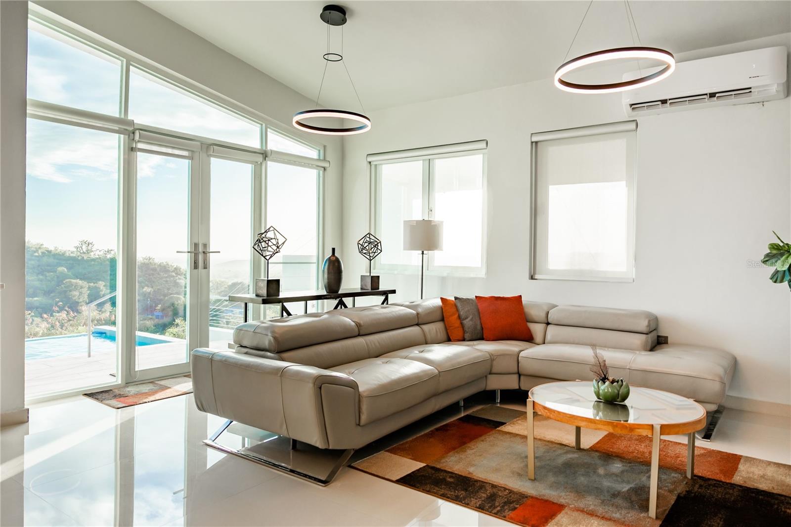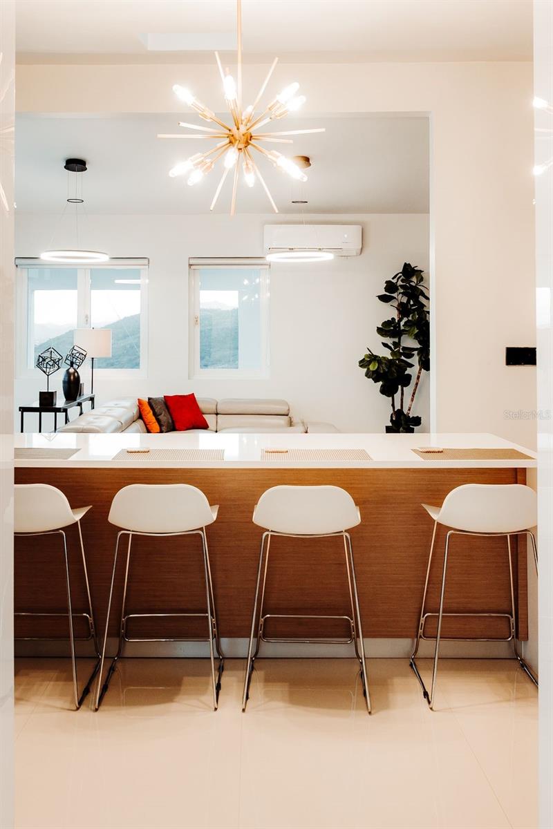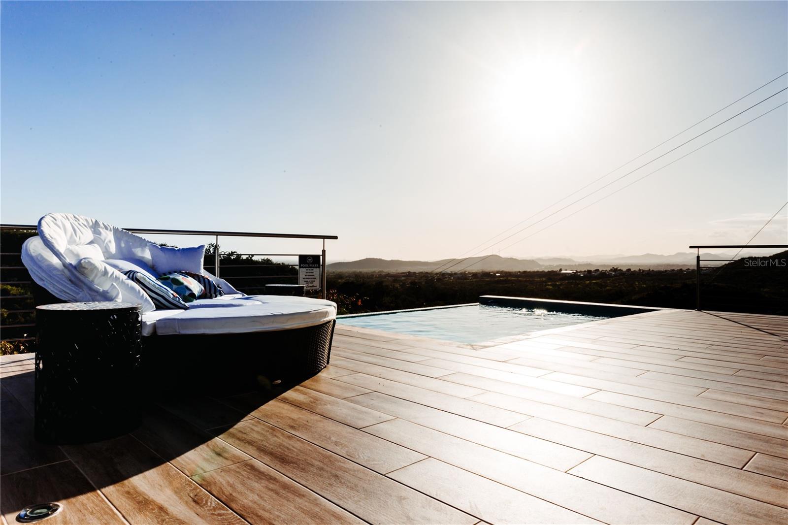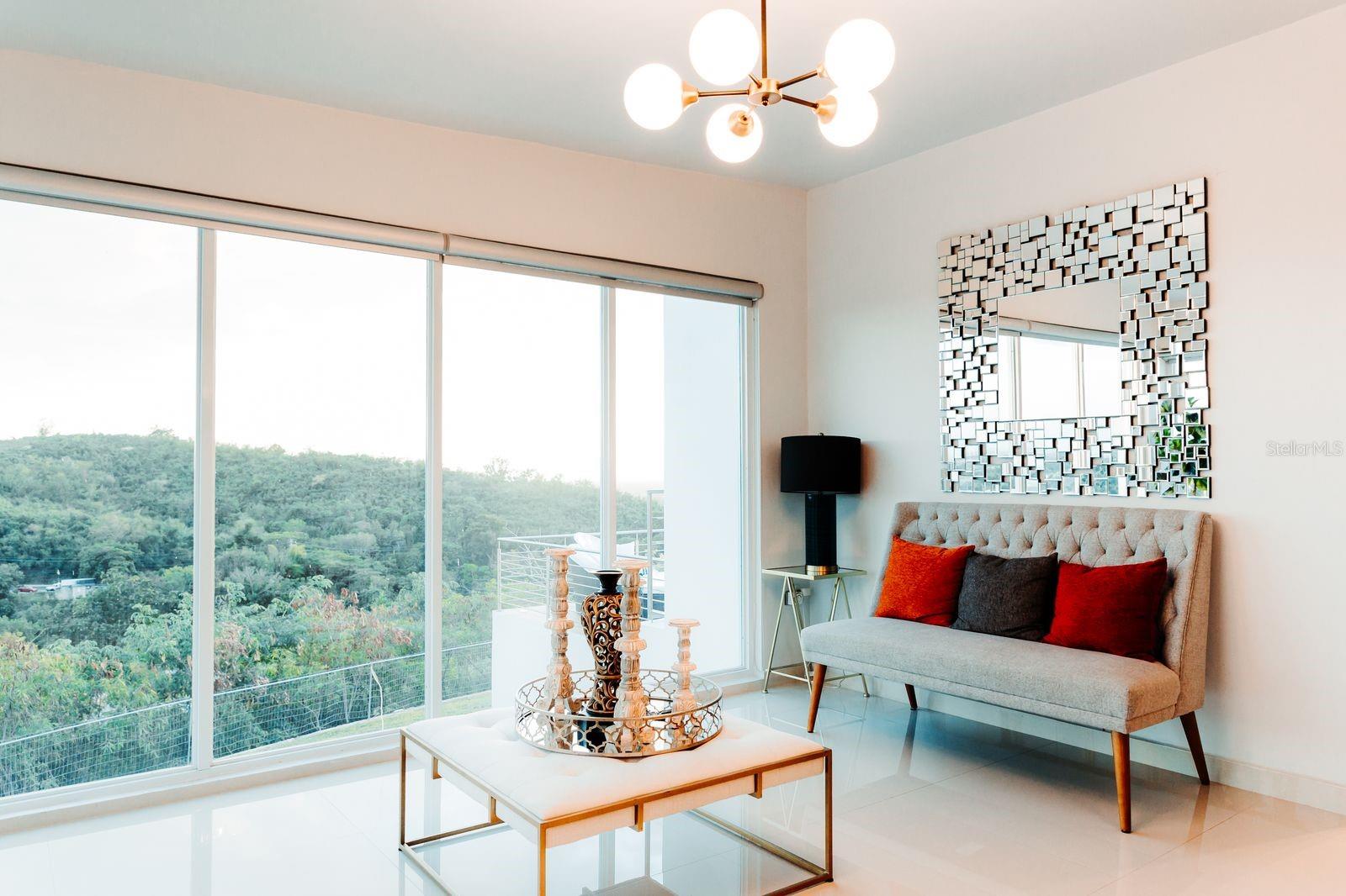 From the living room, glass doors open to an expansive deck and balcony that cascade toward an infinity-edge pool, where uninterrupted views stretch from the mountains to the Caribbean Sea. The elevated setting ensures exceptional privacy, cooling breezes, and dramatic sunsets—an experience that feels worlds away, yet remains highly accessible.