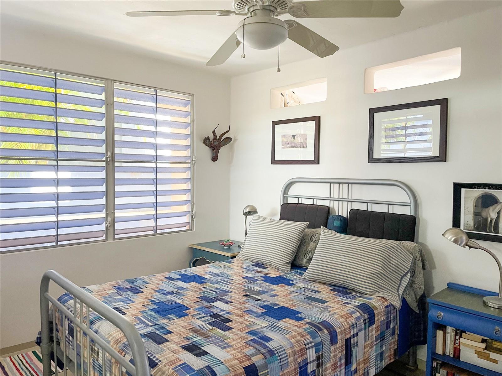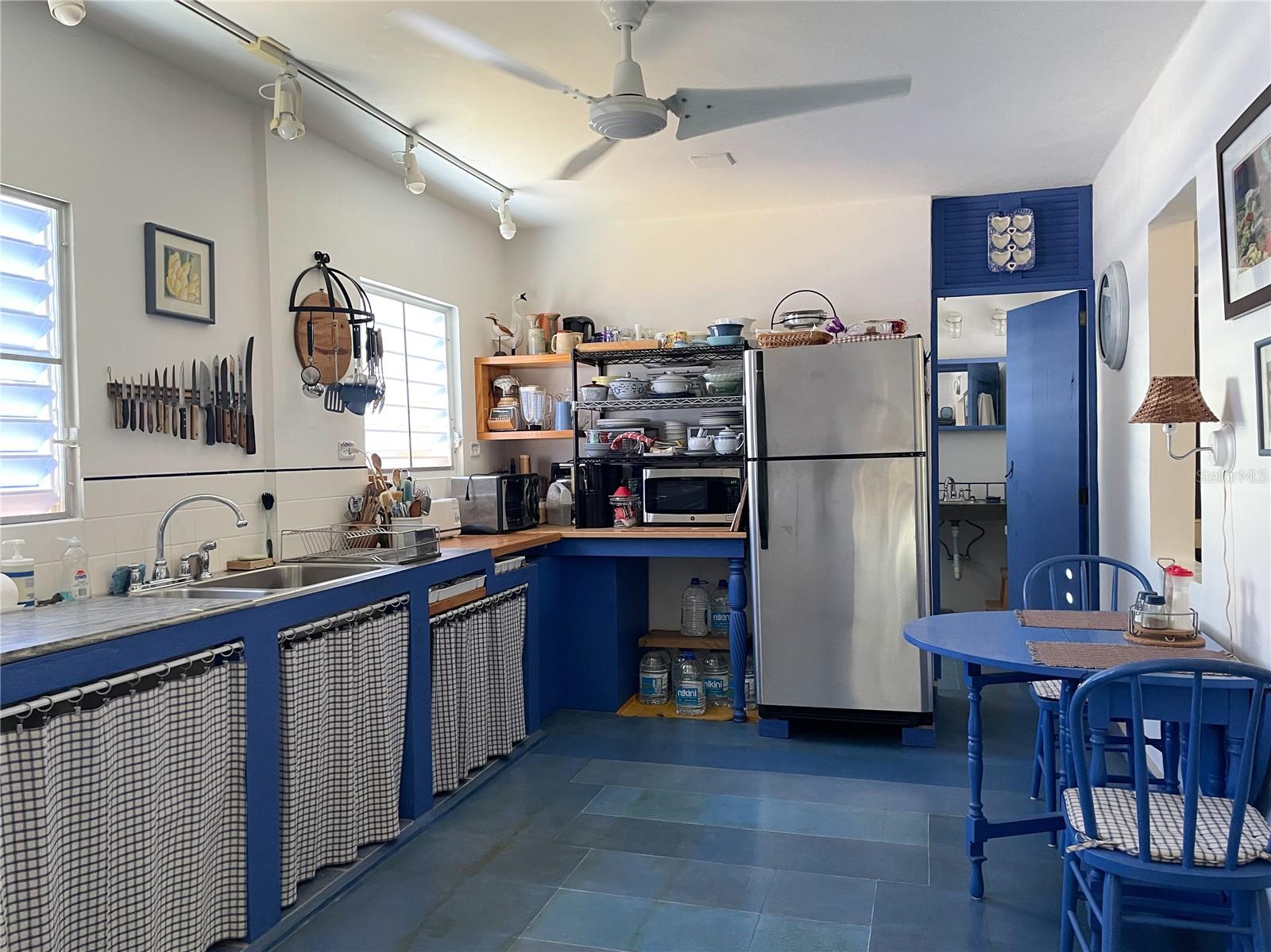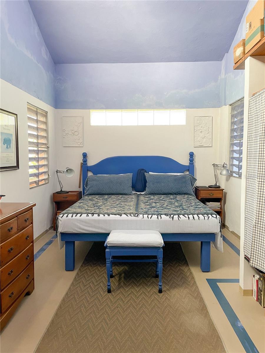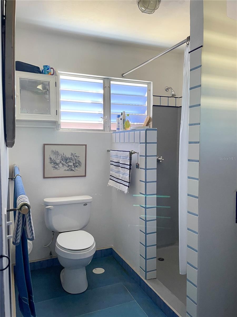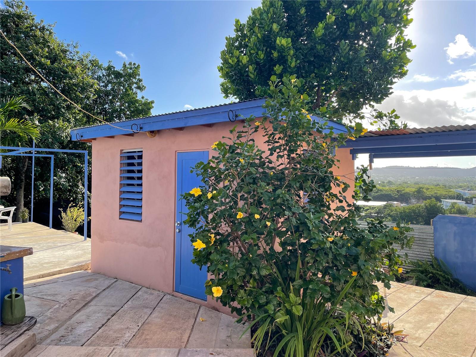 Outside, the backyard is thoughtfully terraced to create inviting outdoor living areas, highlight mountain views of Vieques, and provide space for a potential pool. An additional outdoor structure, currently used as storage (formerly an outhouse), includes an outdoor shower and presents excellent potential to be converted into a full guest bath to serve the studio workshop. The studio itself can also function beautifully as a guest space.