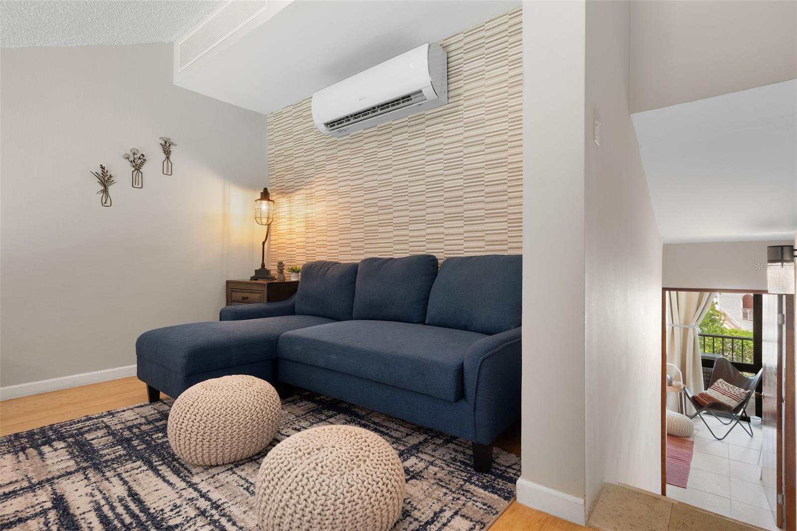 Spanning 1,499 square feet across four levels, the home offers a thoughtful layout that balances open living spaces with comfortable private retreats. The entry level welcomes you with a gracious foyer, a dedicated laundry room, and ample storage. One level up, the heart of the home unfolds into a bright, airy living and dining area with a bar-style kitchen featuring a range hood and wall-mounted storage units. Step out onto the balcony and let the golf course and lake views become your everyday backdrop. The primary suite on this level is a peaceful sanctuary with a built-in closet, private bathroom, and split unit air conditioning.