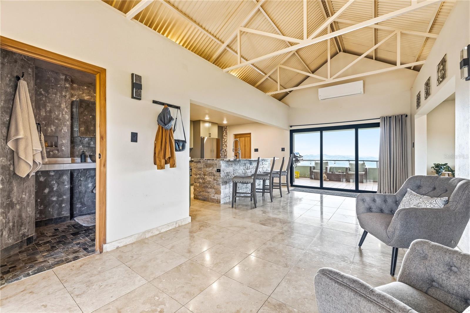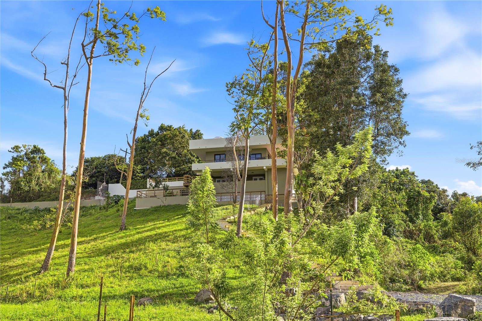 Perched at approximately 1,000 meters in the central mountains of Puerto Rico, this exceptional 4-bedroom, 4-bathroom home sits on 5 acres of lush land, offering 120° horizon views and unmatched privacy. Accessed via a long private driveway, the property is surrounded by nature, creating a serene and tranquil escape.